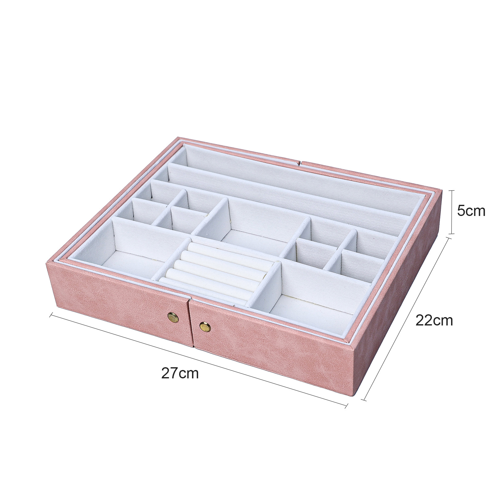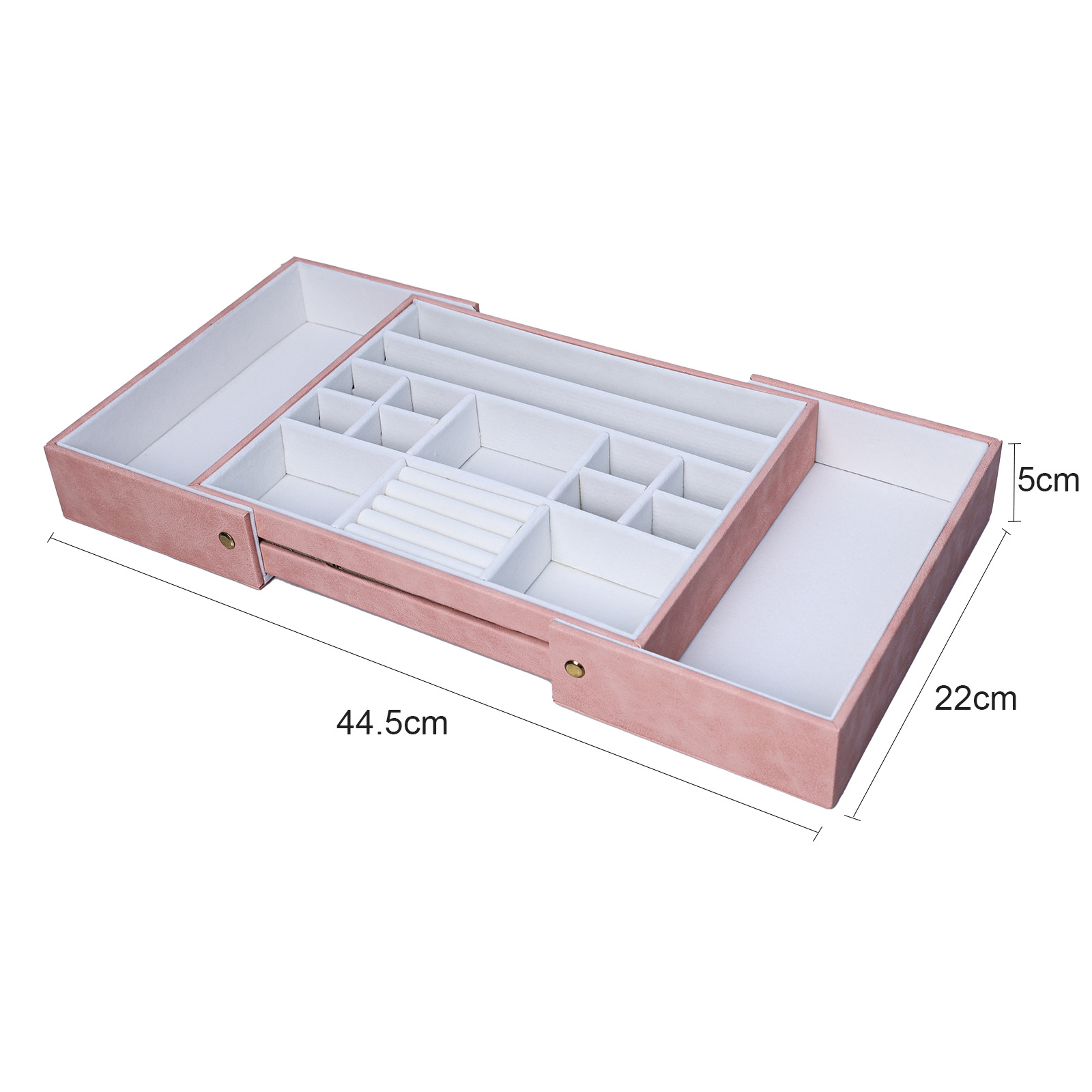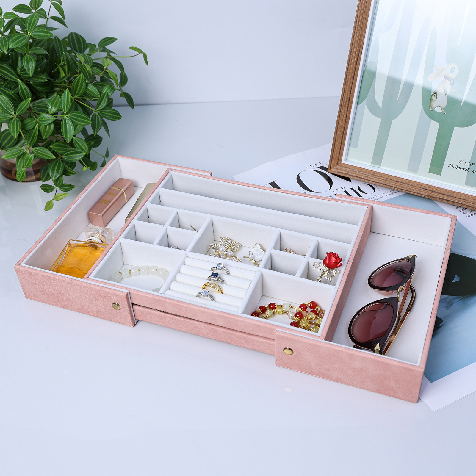 Hambyrddau trefnydd drôr gemwaith personol Addasadwy a HyblygMae lledr yn ddeunydd hyblyg, sy'n caniatáu addasu hawdd. Gellir gwneud hambyrddau droriau lledr pinc mewn gwahanol feintiau a siapiau i ffitio gwahanol ddimensiynau droriau yn union. Gellir eu dylunio gyda rhannwyr neu adrannau, gan ddarparu storfa drefnus ar gyfer gwahanol fathau o eitemau. Er enghraifft, mewn drôr desg, gall hambwrdd lledr pinc wedi'i addasu gydag adrannau wahanu pennau, clipiau papur a llyfrau nodiadau bach yn daclus. Mae'r hyblygrwydd hwn mewn dyluniad yn ei gwneud yn addas ar gyfer ystod eang o anghenion storio mewn gwahanol ystafelloedd yn y tŷ.