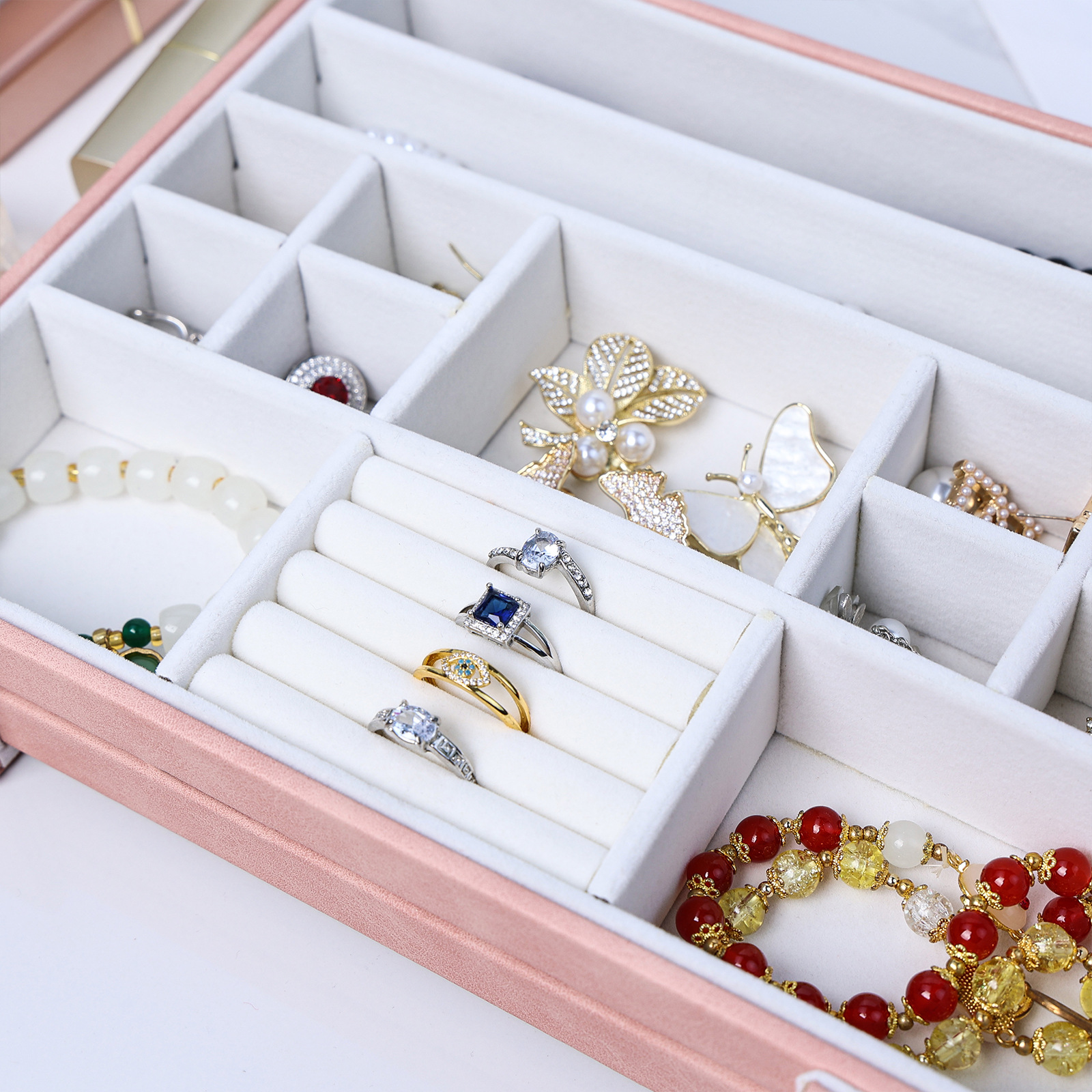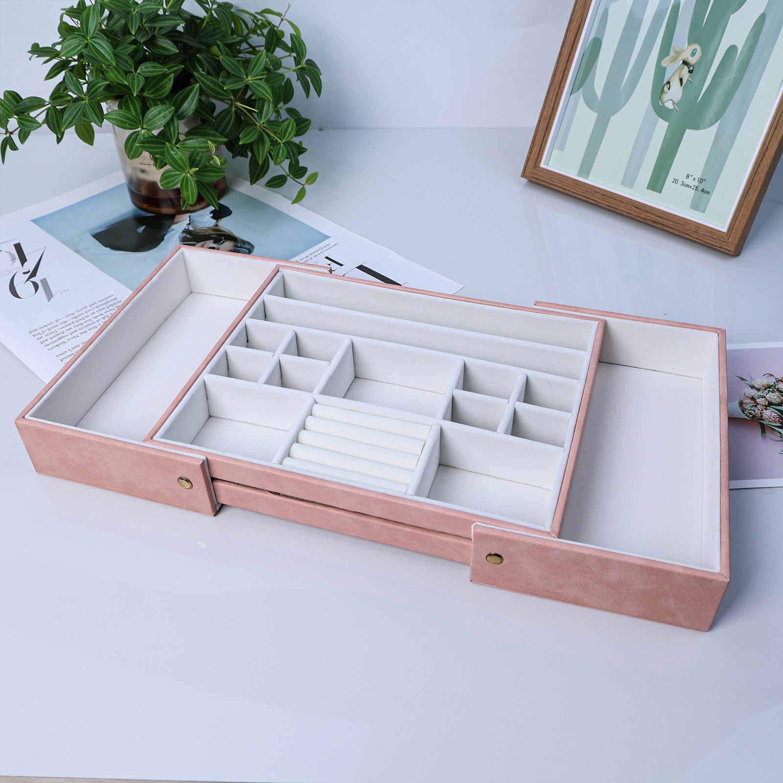 Hambyrddau trefnydd droriau gemwaith personol Hawdd i'w Glanhau a'u Cynnal a'u Cynnal:Mae glanhau hambwrdd drôr lledr pinc yn gymharol syml. Ar gyfer mân faw neu staeniau, mae sychu syml gyda lliain llaith fel arfer yn ddigonol. Os oes staeniau mwy ystyfnig, gellir defnyddio glanhawr lledr ysgafn. Mae lledr yn llai tebygol o amsugno gollyngiadau a staeniau o'i gymharu â hambyrddau wedi'u leinio â ffabrig, sy'n helpu i gynnal ei olwg ddeniadol dros amser. Mae cynnal a chadw rheolaidd nid yn unig yn cadw'r hambwrdd i edrych yn dda ond mae hefyd yn ymestyn ei oes.