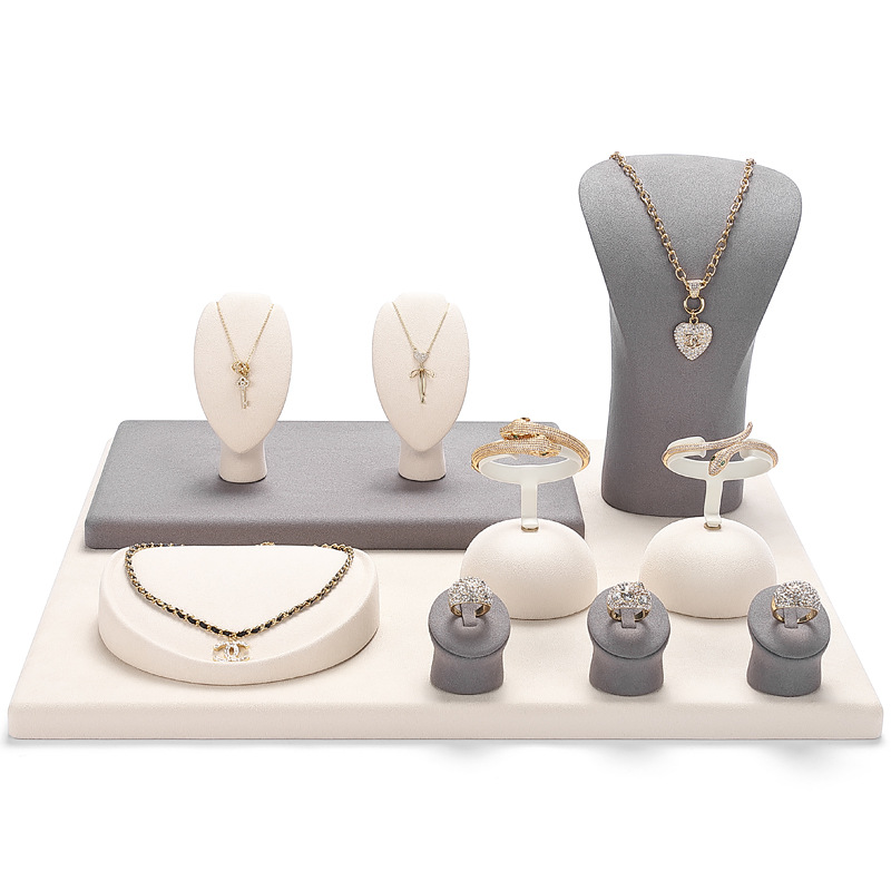 Բաց երանգներ (սպիտակ, բեժ, բաց մոխրագույն)Իդեալական են սառը երանգների զարդերի համար, ինչպիսիք են մարգարիտները, պլատինը և արծաթը, այս գույները ընդգծում են մաքրությունն ու նրբագեղությունը: Սպիտակ մարմարե կամ ակրիլային սկուտեղները անժամանակյա ընտրություններ են: