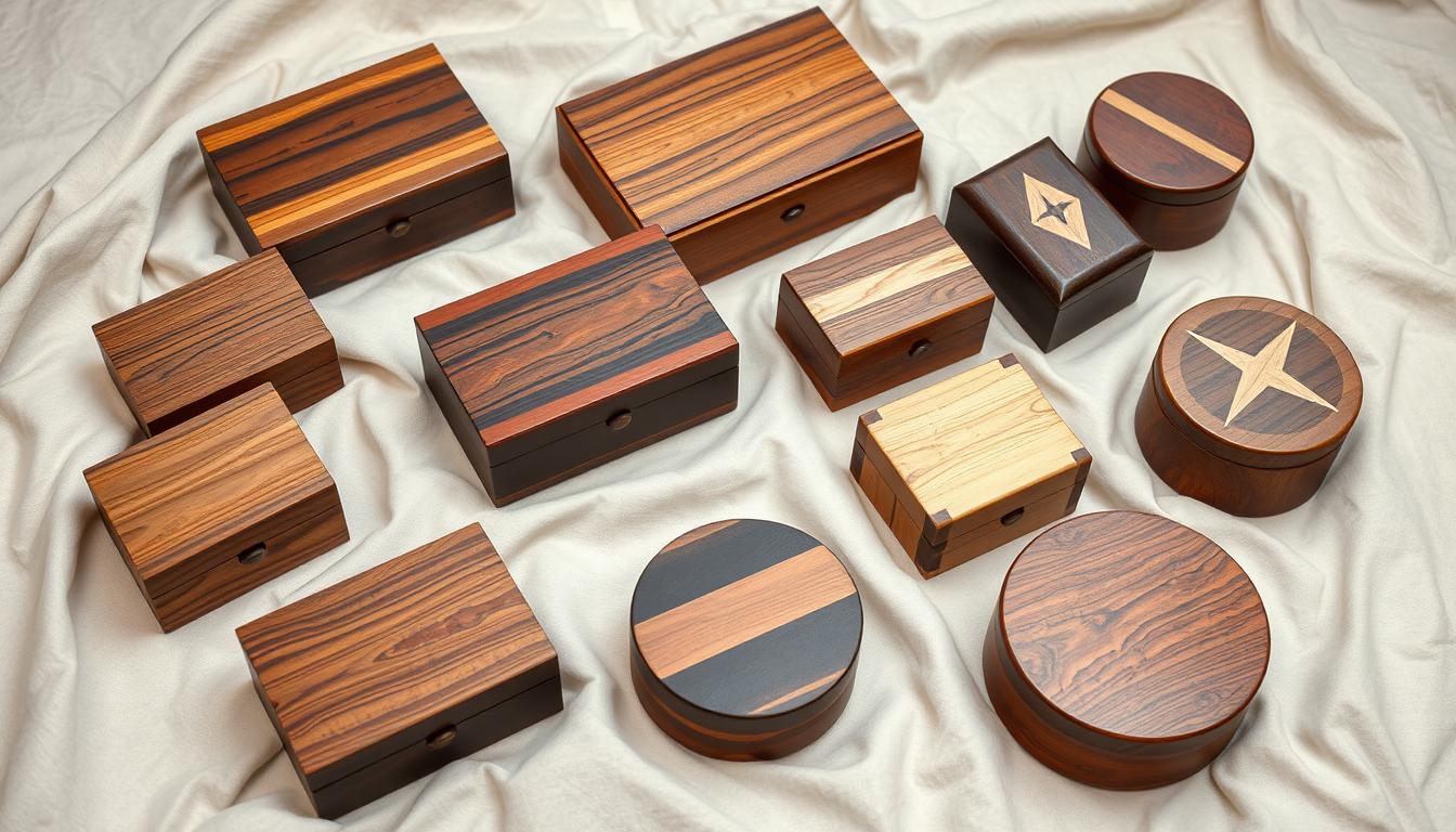 Our collection includes exotic woods like Bubinga, Padauk, and Zebrawood. These woods make jewelry boxes look stunning. Their unique grains and colors stand out. Yet, some people might react to woods like Bubinga and Padauk.