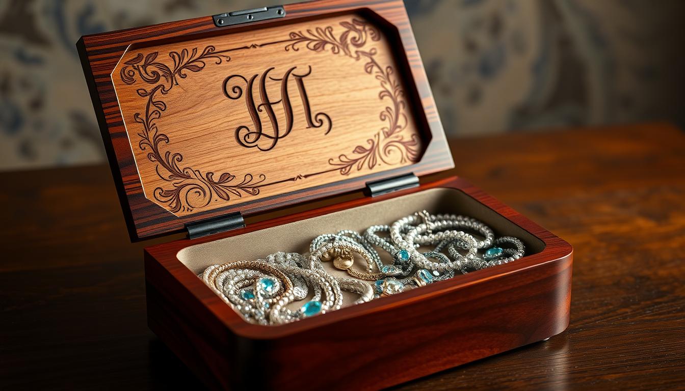 Crafting a unique personalized jewelry box involves attention to detail. We select the best materials and engrave with precision. This ensures your box is both beautiful and long-lasting. The features we offer make your design experience outstanding: